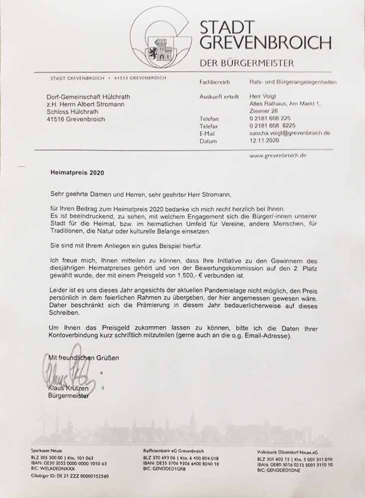 Im Jahr 2019 erhielt die Dorf–Gemeinschaft–Hülchrath, keinen Uuschlag zum „Heimatpreis 2020“ der Stadt Grevenbroich.
