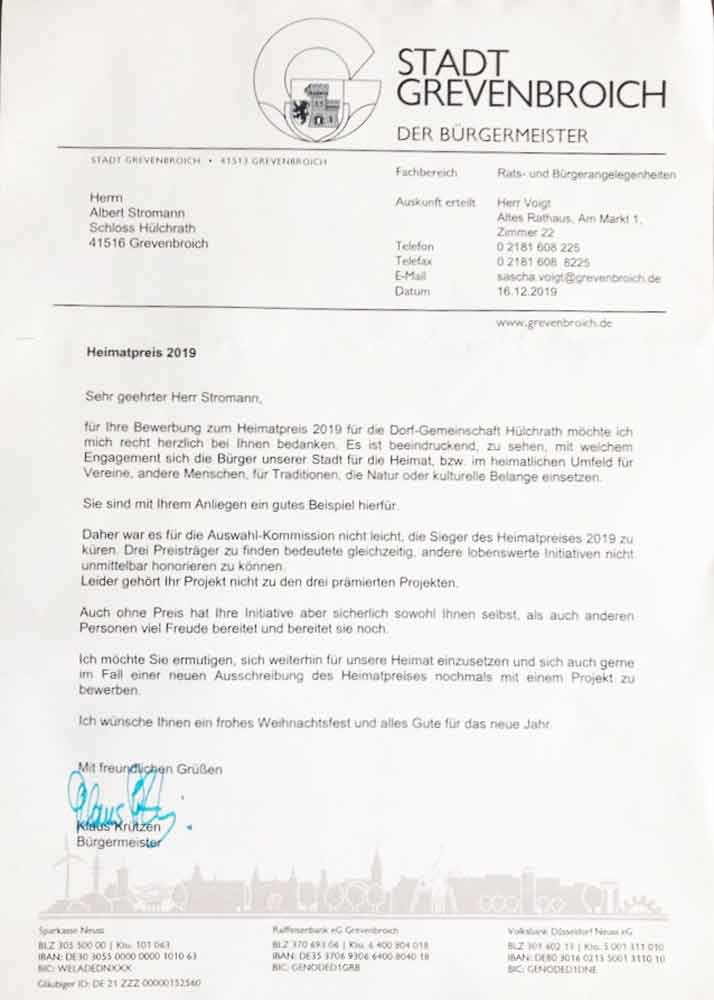 Brief Absage zum „Heimatpreis 2019“ der Stadt Grevenbroich