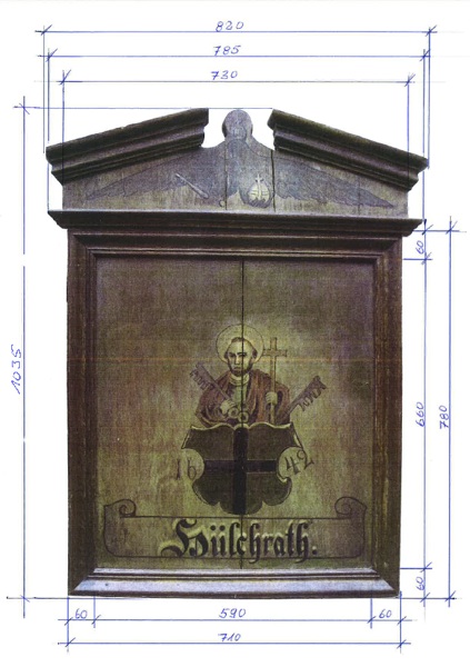 Idee: Im Sinne des Leitbildes der Dorfgemeinschaft Hülchrath „Vergangen-heit wahren", soll über der Eingangstür zum ehemaligen Bürgermeisterhaus, das historische Stadtwappen der „Stadt Hülchrath" wieder angebracht werden.
