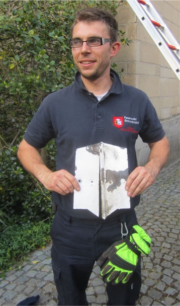 Durch die Feuerwehr Einheit Hülchrath/Münchrath wurde das Zifferblatt im Rahmen einer Übung mit der tragbaren Leiter aus der Dachrinne geborgen.