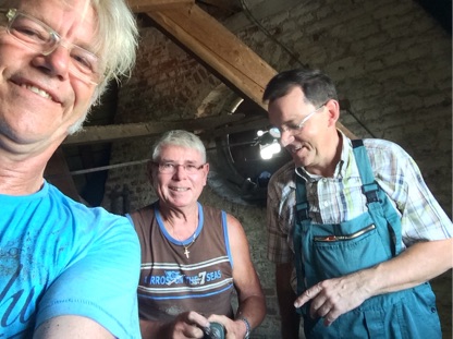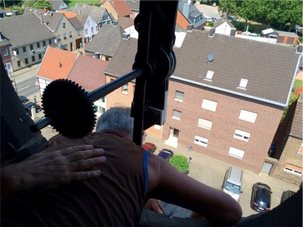 Zur Montage des Zifferblatts musste im Innern des Kirchturmes, auf ca. 22 m Höhe, die Holzverkleidung und das Antriebsgestänge der Westuhr bei 38°C Raumtemperatur im Kirchturm demontiert werden.