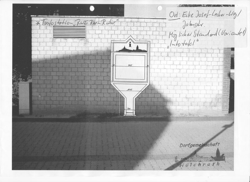 Nachdem Herr Armin Day der Dorfgemeinschaft einen Vitrinenkasten kostenlos zur Verfügung stellte, konnte mit Hilfe der RWE Power AG Kraftwerk Frimmersdorf/Neurath und durch Vermittlung von Herrn Paul Lauterbach die Erstellung der „INFO-TAFEL" beginnen.