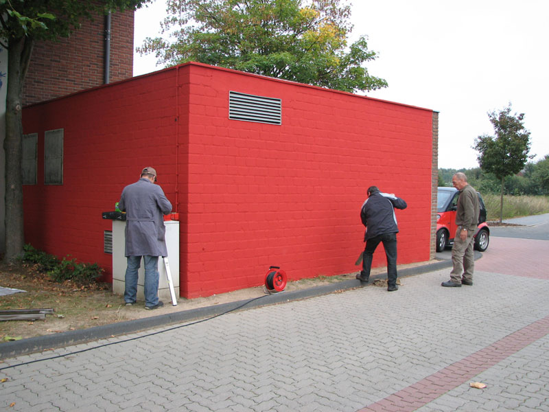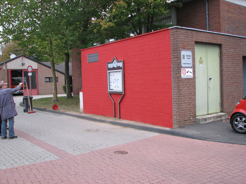 Im Laufe der weiteren Planungen wurde darüber nachgedacht, wie das vorhandene Umfeld (Garage und Trafostation) attraktiver gestaltet werden könnte. Kurzfristig wurden die Außenwände mit einem neuen Anstrich in einem roten Farbton versehen. Ende September 2009 erfolgte die Errichtung der „INFO-TAFEL" an der genannten Stelle.