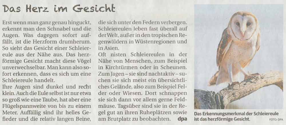 Wissenswertes über die Schleiereule (Quelle: NGZ vom 07.08.2021)