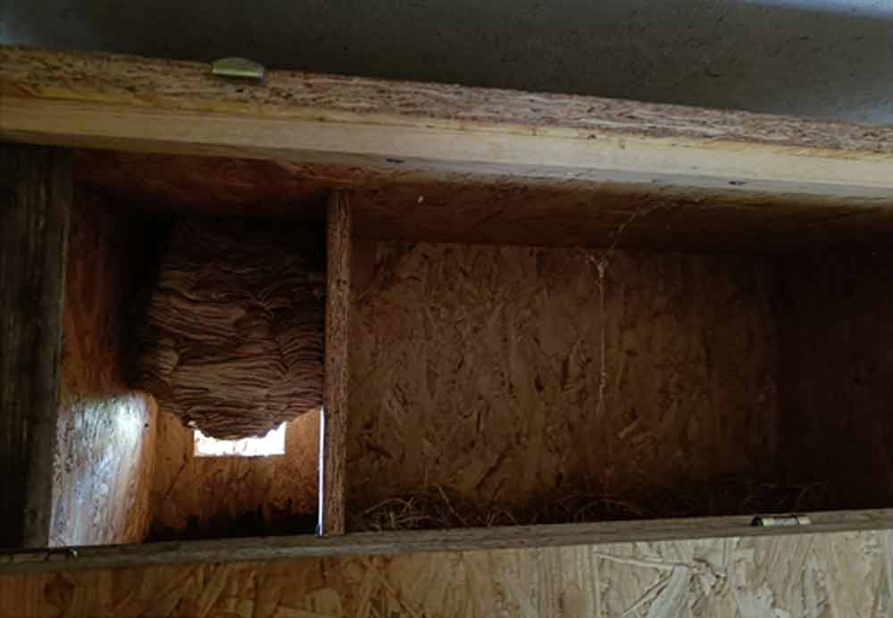 Hornissennest im Eingangsbereich des Schleiereulen-Nistkasten (Februar 2022)