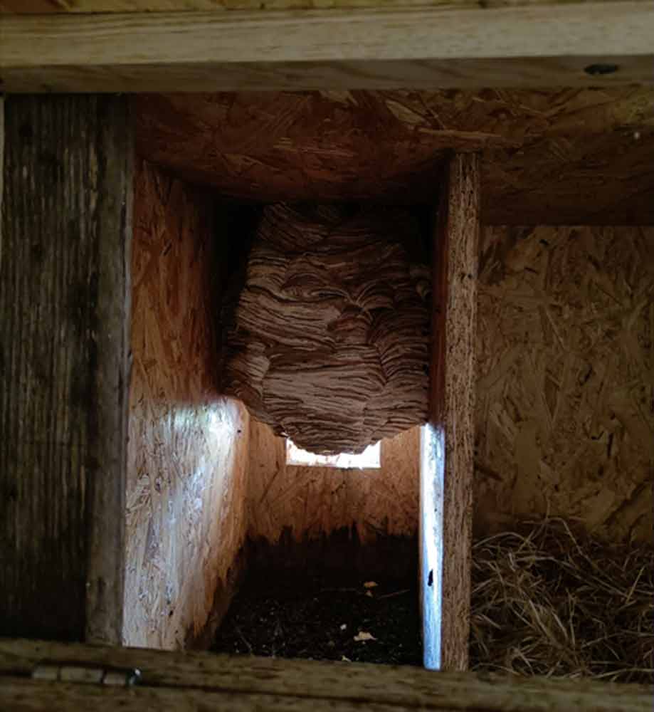 Im Rahmen der erneuten Überprüfung fanden wir ein weiteres nicht mehr bewohntes Hornissennest (ca. 25 cm Durchmesser) im direkten Eingangsbereich zum Schleiereulen-Nistkasten.