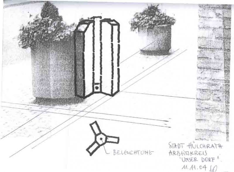 Die erste Idee war die Montage der Preise und Plaketten auf einem Findling. Nach weiteren Überlegungen, Skizzen und Gesprächen im Ort wurden alte Treppenstufen in Form von beleuchteten Stelen favorisiert.