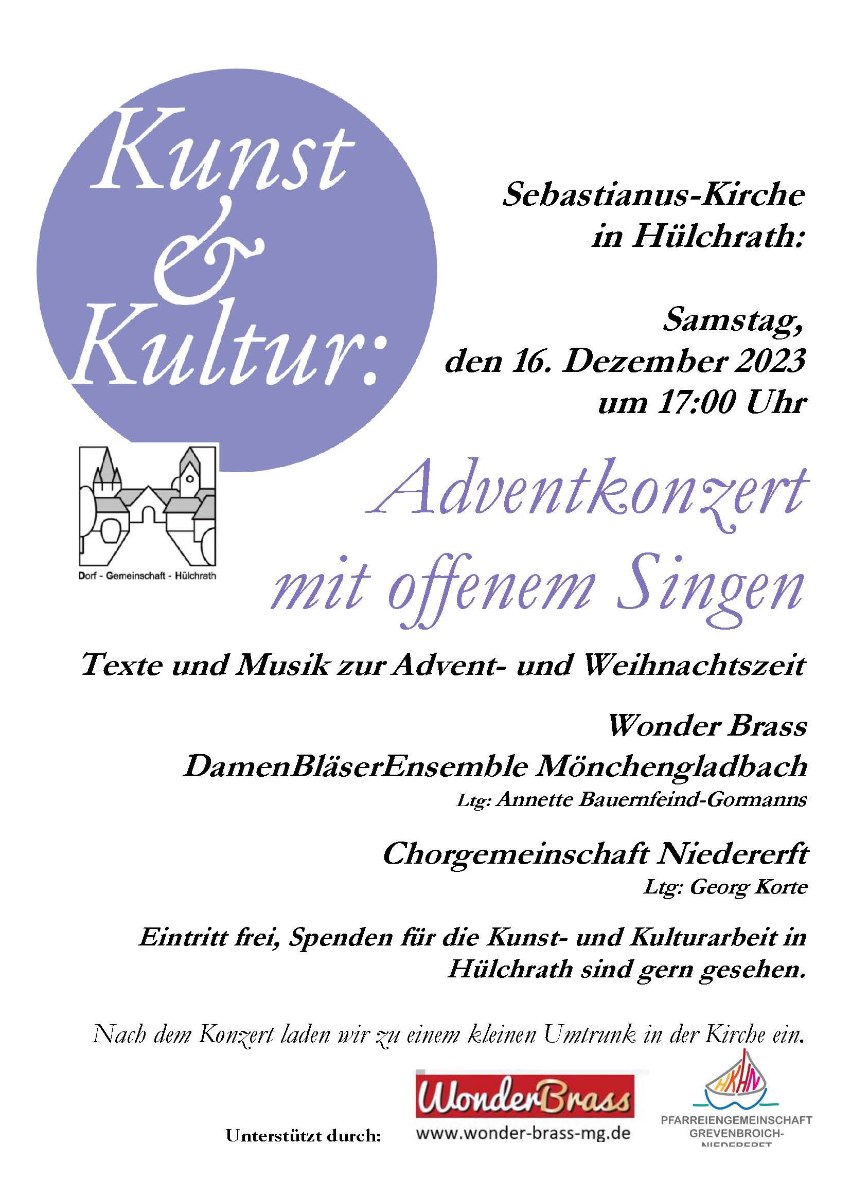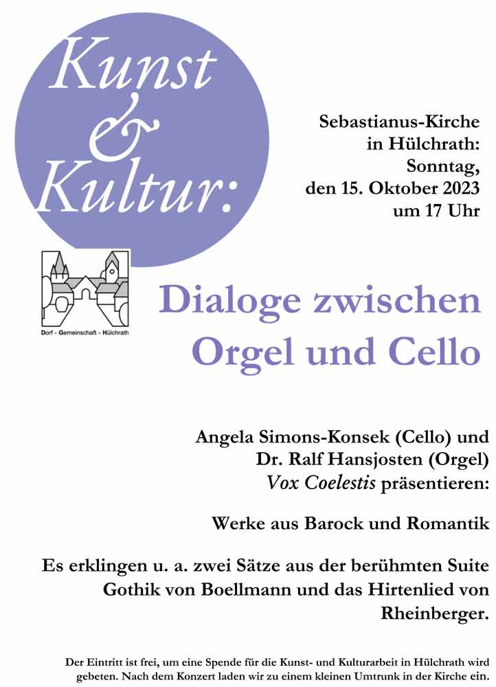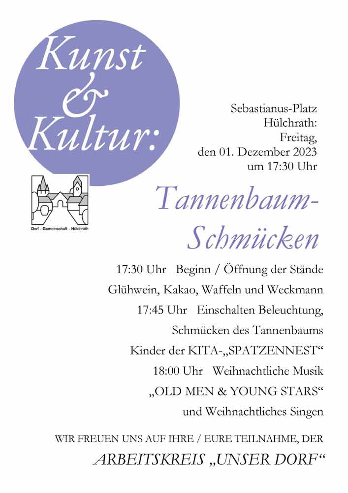 Die Arbeitsgruppe „Kunst und Kultur in Hülchrath“ (AG KuK) als Teil der Dorf-Gemeinschaft-Hülchrath (DGH) hat sich zum Ziel gesetzt die Aktivitäten im Bereich Kunst und Kultur in Hülchrath zukünftig zu organisieren und durchzuführen.
