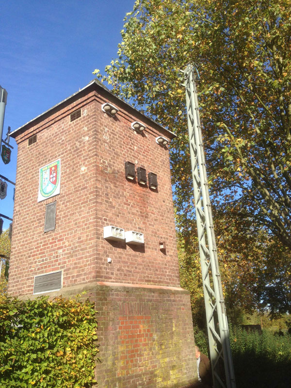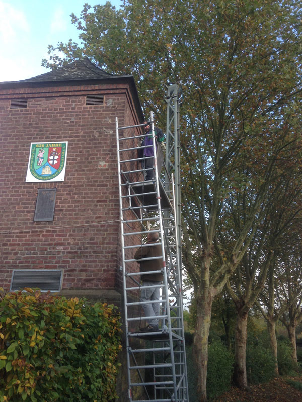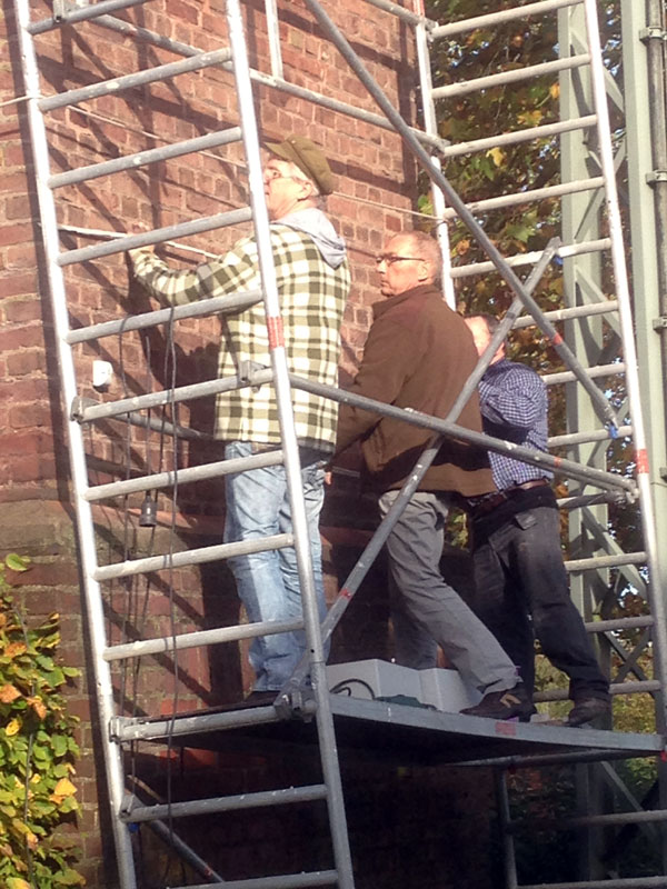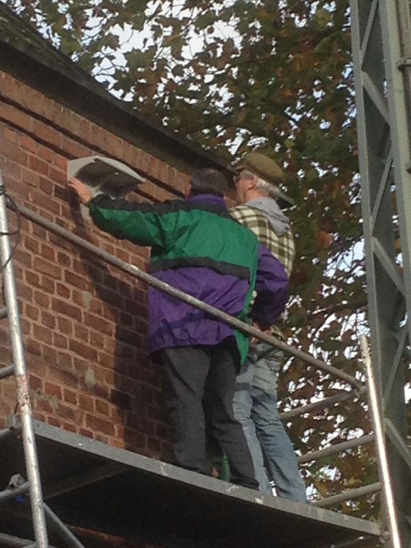 Der Turm wurde erst kürzlich am 25/26. Oktober eingerüstet, um für die nötige Sicherheit der Helfer zu sorgen, damit das Anbringen von Mehlschwalben- und Fledermausnestern sowie für die Sperlings-Behausungen fachgemäß vonstatten gehen konnte. Die wetterfesten Nisthilfen waren rechtzeitig bestellt worden und auch pünktlich zur Stelle. Der Schleiereulenkasten wurde in Eigenarbeit (Paul Steins) angefertigt und konnte nur in Einzelteilen im Inneren des „Travogelhauses“ hochgebracht und zusammengesetzt werden, da der Kasten zu groß und die Einstiegsluke zu klein waren. Das Einflugsloch für die Eule wurde durch das vorhandene Lüftungsrechteck unterhalb der Dachkante (Nordseite) gebrochen.